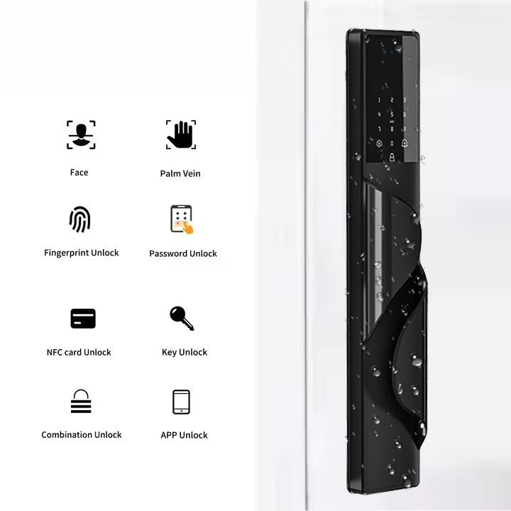 Unlocking Methods: Tuya app, palm unlock, face recognition, fingerprint, PIN code, RFID card, and mechanical key. 0.3s rapid verification with 99.98% recognition accuracy.